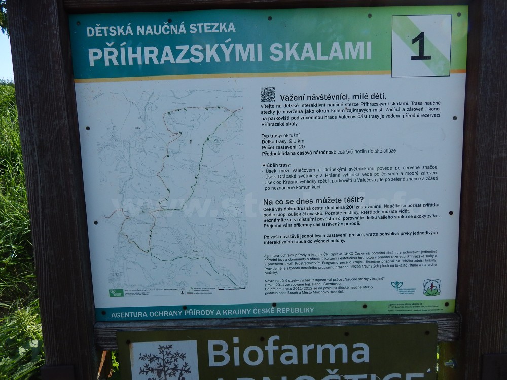 Návštěvu naučné stezky zahájíme v obci Boseň, na parkovišti pod skalním hradem Valečov, kde se u kiosku nachází 1. zastávka (Dětská naučná stezka Příhrazskými skalami).