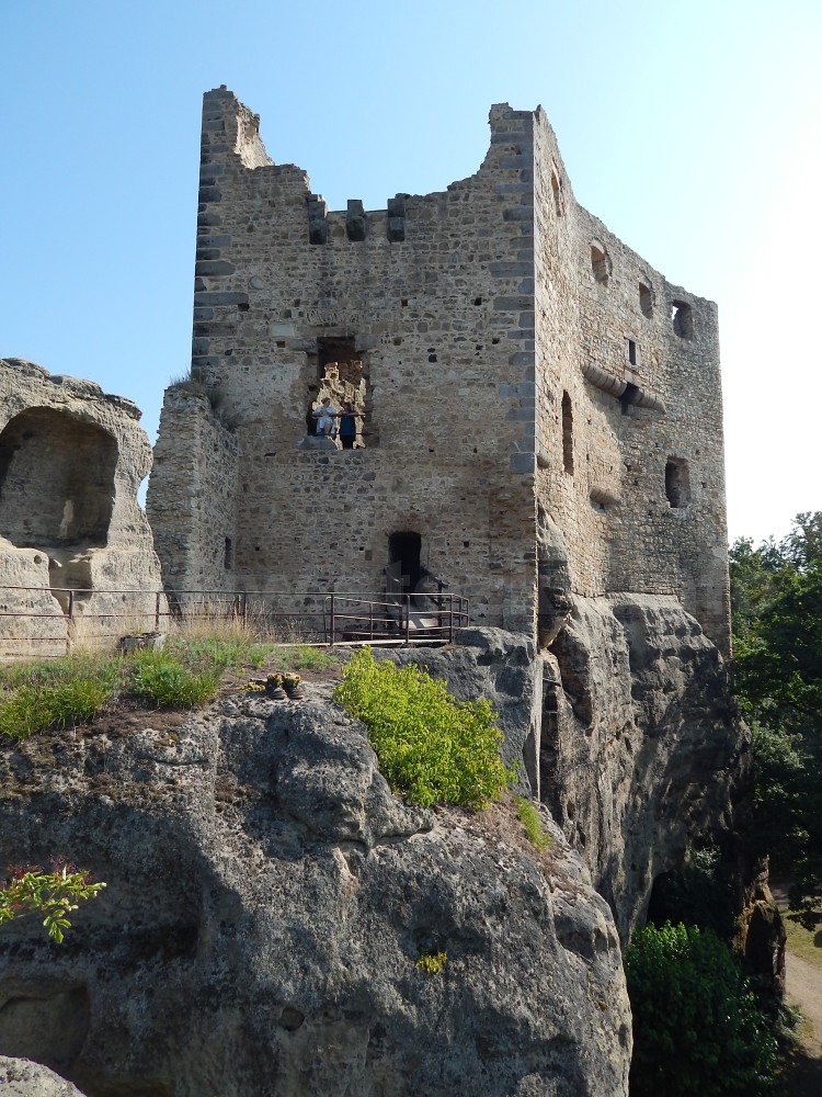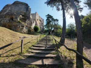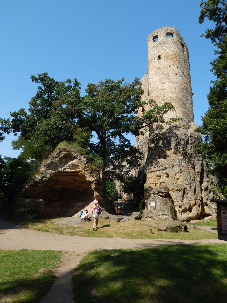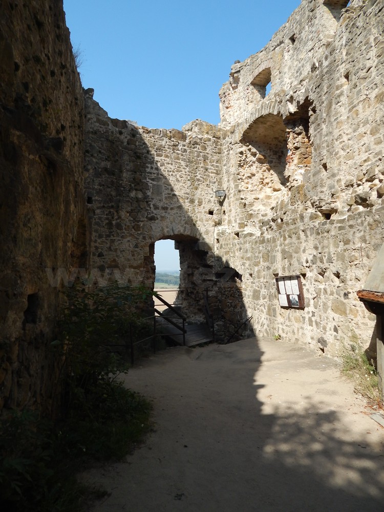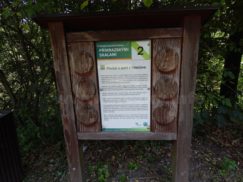 Od ní vyrážíme vzhůru po schodech po červené, žluté a zelené turistické značce a pak vpravo asi 300 metrů k již viditelné siluetě skalního hradu. Přijdeme k němu, projdeme přímo jeho areálem a na malé ploše za hradem nalezneme 2. zastávku (Pověst o paní z Valečova).