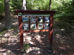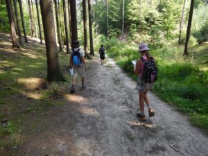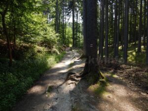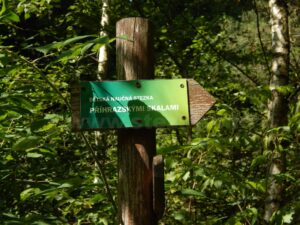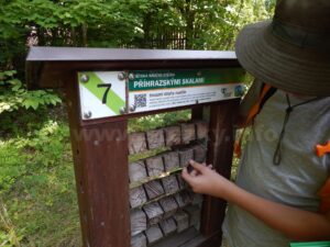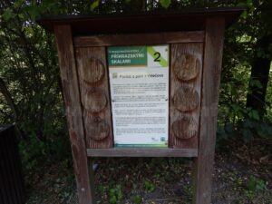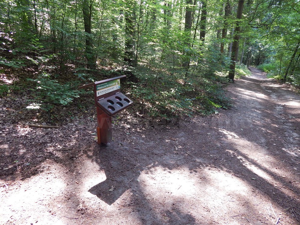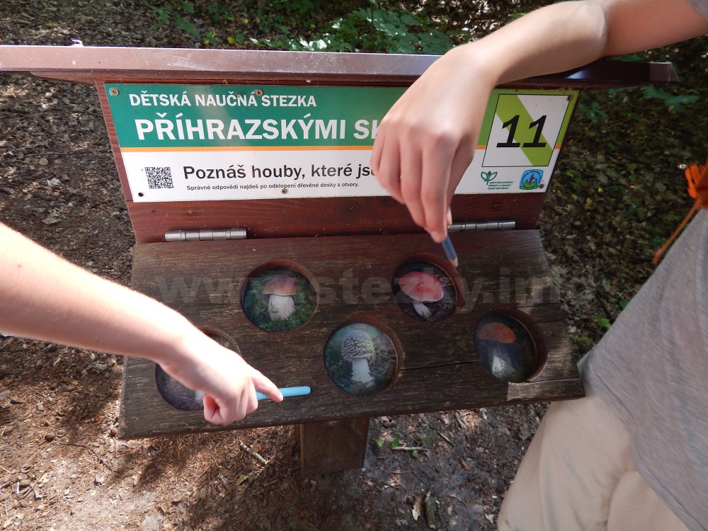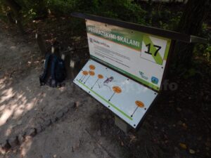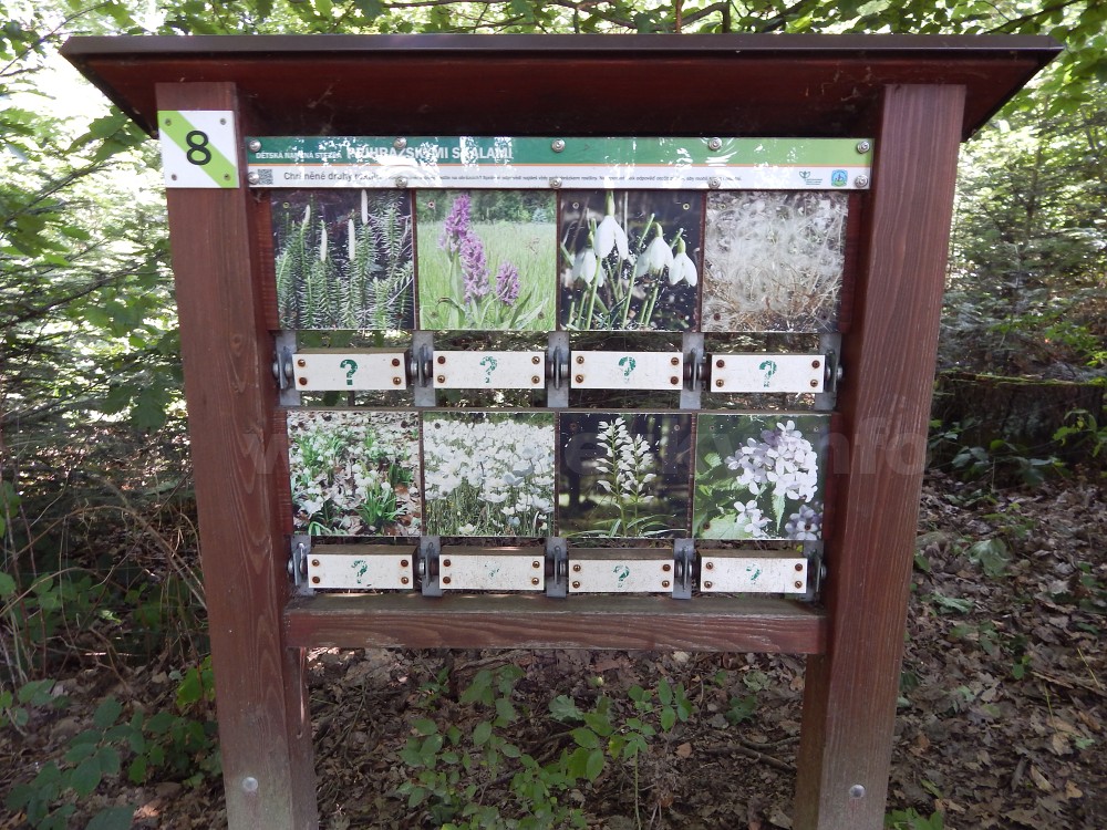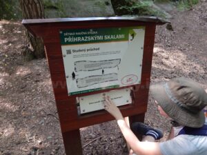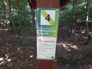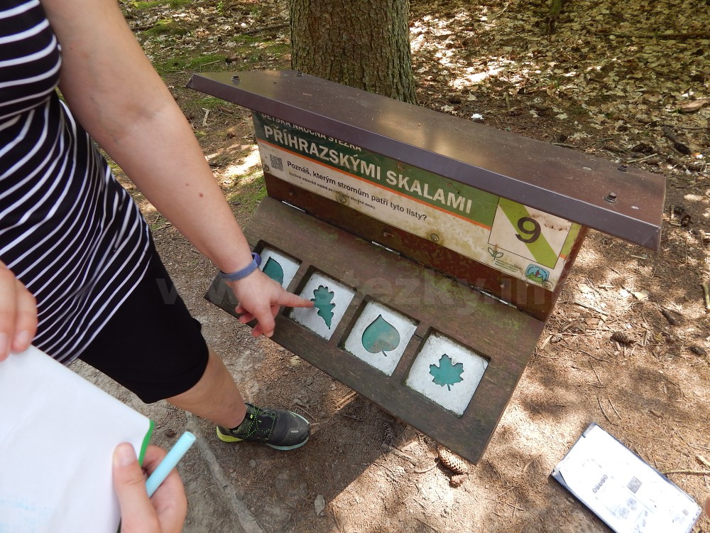 Dále jdeme členitou lesní cestou, zpočátku po rovině, ale za pravotočivou zatáčkou začneme klesat. Postupně potkáme nedaleko po sobě 8. zastávku (Chráněné druhy rostlin), 9. zastávku (Poznáš, kterým stromům patří tyto listy?) a ve stoupání 10. zastávku (Skalní města CHKO Český ráj).
