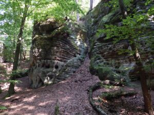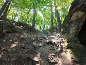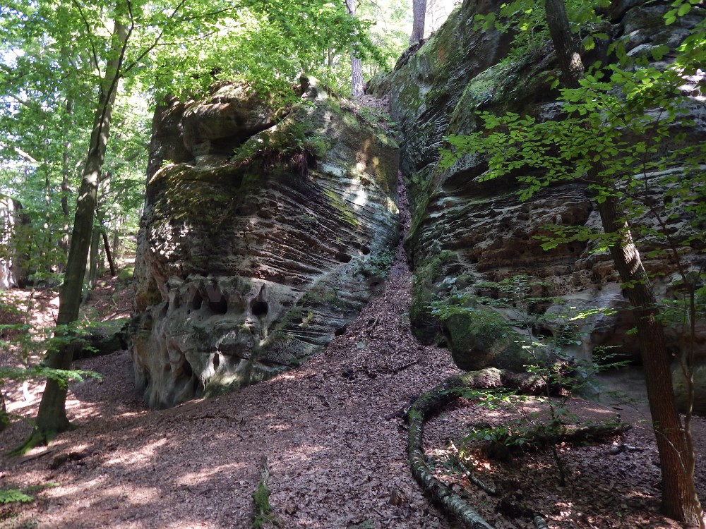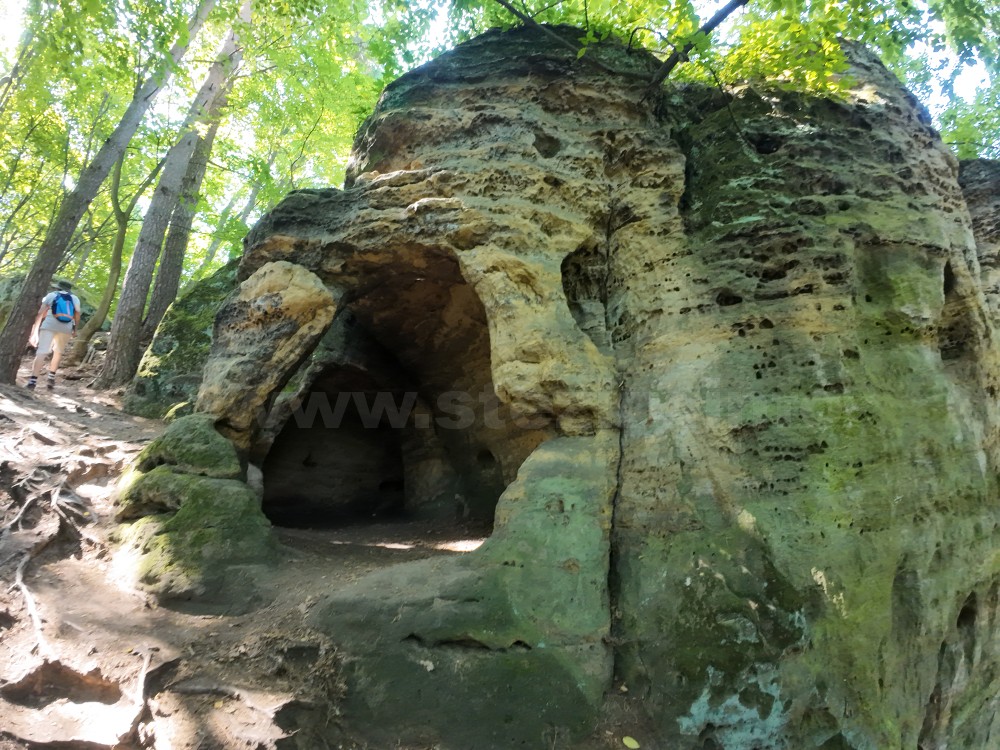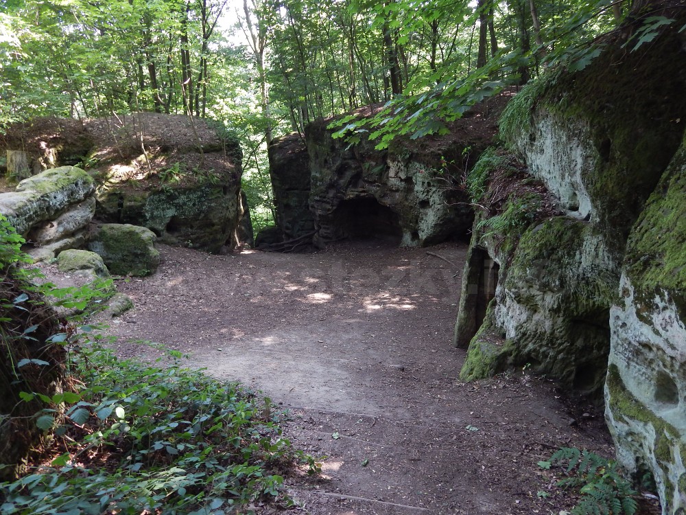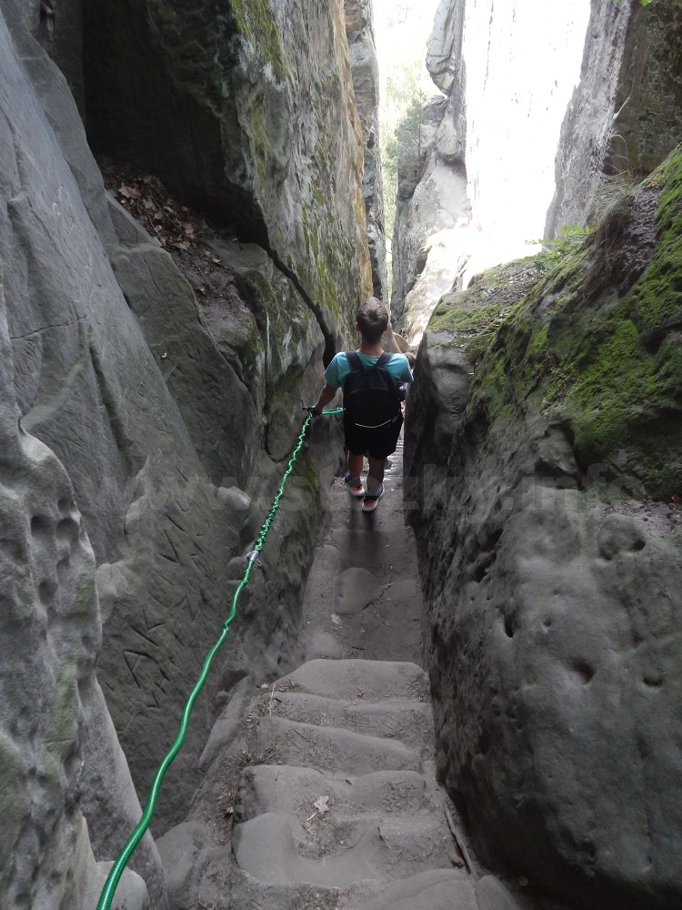 Po případné prohlídce pokračujeme dále po červené značce vzhůru lesem a pak po okraji travnaté náhorní plošiny, odkud následně sestoupíme skalní rozsedlinou po příkrém schodišti do prostoru se vstupem do Drábských světniček. Tato část trasy by měla být od září 2025 do června 2026 úplně zavřená z důvodu znovuzpřístupnění dlouhodobě uzavřených Drábských světniček.