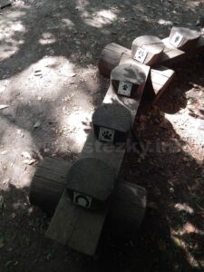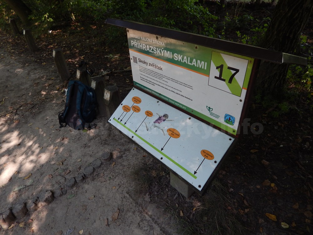 Nakonec vystoupáme až ke kraji lesa, kde po pravé straně na odbočné cestě nalezneme 17. zastávku (Skoky zvířátek).