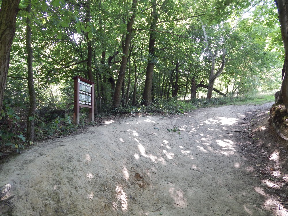 Za bezejmenným rozcestím stoupáme tedy lesní cestou v přímém směru po modré značce a potkáme postupně 13. zastávku (Pověst o obrovi Drábovi) a 14. zastávku (Porostní skladba lesa). Pak se naštěstí červená a modrá značka opět spojí a vedou stejnou cestou.