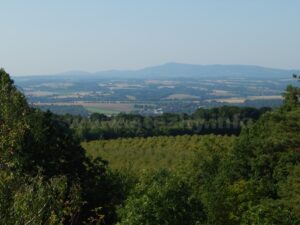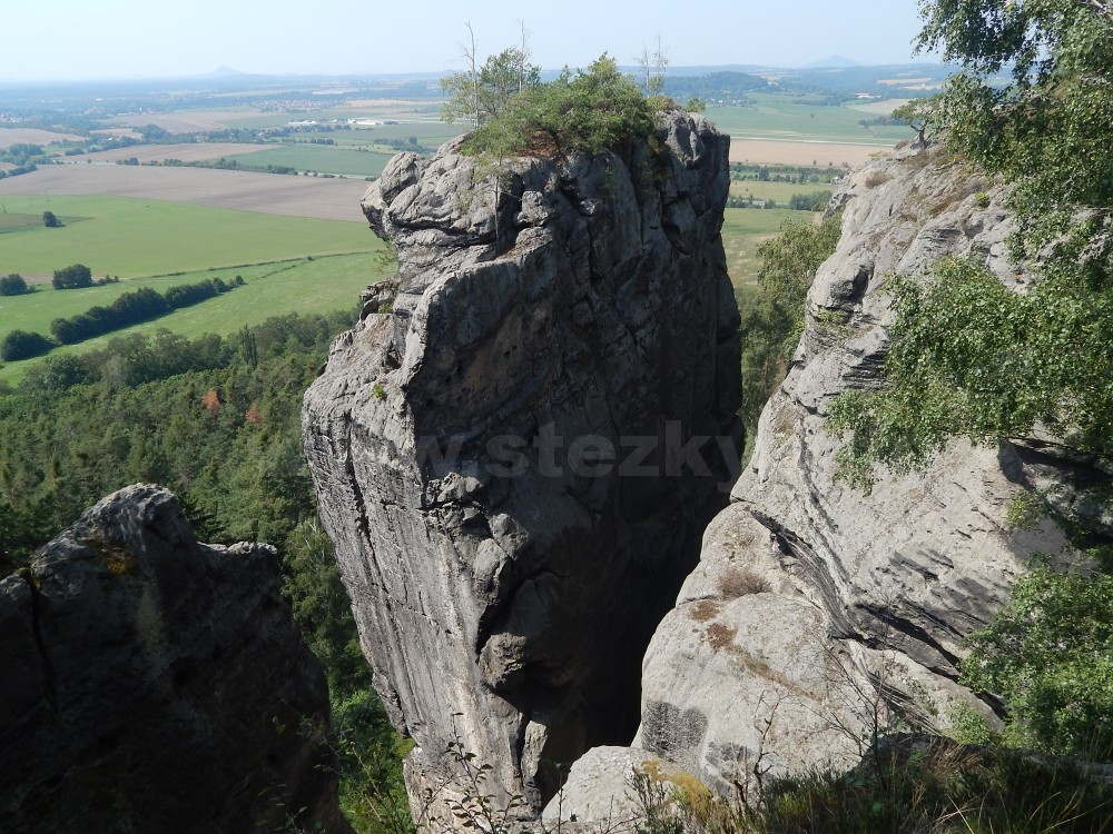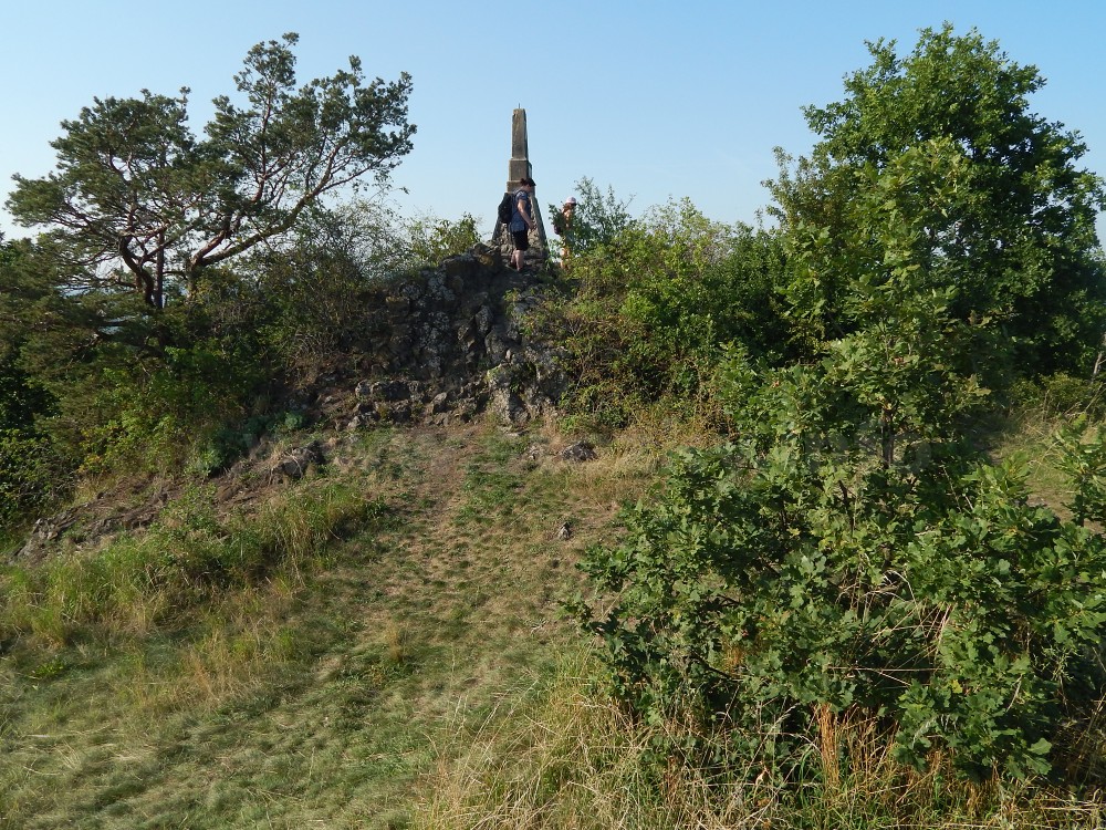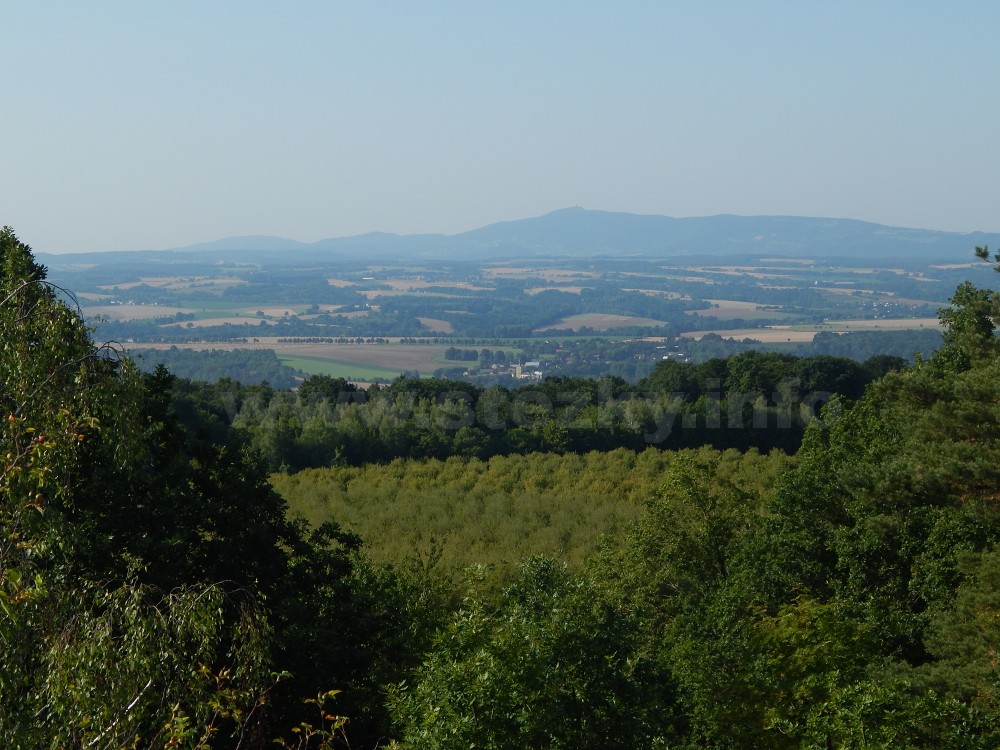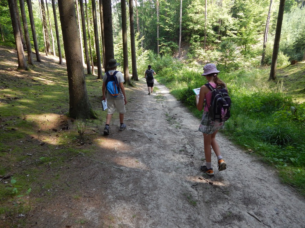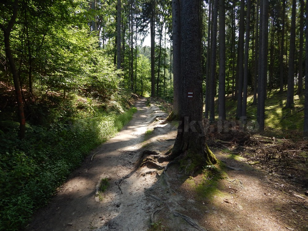 Za Světničkami začneme opět stoupat po červené značce, ale o něco výše červenou opustíme a pokračujeme po modré. Zde pozor, tato část je chybně vyznačena v plánku naučné stezky. Zdá se, že původně vedly červená a modrá značka shodně po stejné cestě, ale časem to bylo přeznačeno tak, že modrá vede původní trasou naučné stezky, zatímco červená odbočuje vlevo a vede po okraji náhorní plošiny s výhledy do kraje. Bohužel my jsme zde nuceni jít méně zajímavou cestou lesem po modré značce (protože na ní jsou umístěné zastávky naučné stezky).