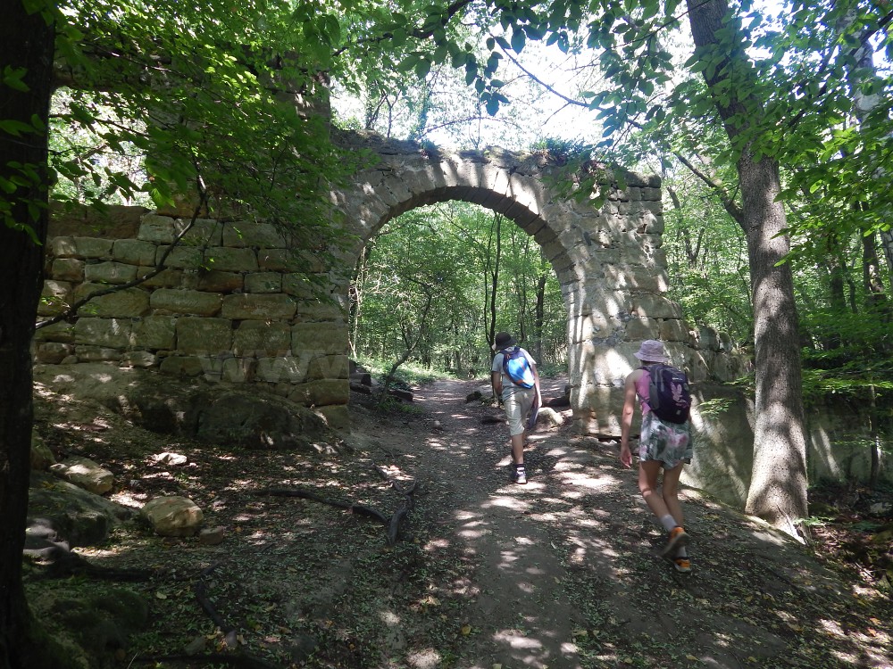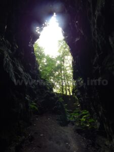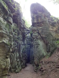 Dále cesta mírně klesá, projdeme skalním průchodem Ženská vrata a sestoupíme do kotliny před hlubokou a úzkou skalní rozsedlinou, tzv. Studeným průchodem. Před vstupem se nachází 15. zastávka (Studený průchod).