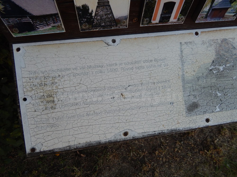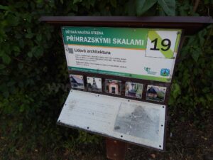 Po výstupu se vrátíme zpět na silnici a pokračujeme dále; silnice bude odteď už jenom klesat. Další, 19. zastávka (Lidová architektura), nás čeká po asi půl kilometru v osadě Mužský u autobusové zastávky.
